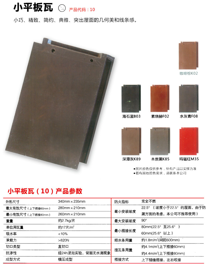 混泥土瓦的瓦配件有普遍的挑選范疇。水泥瓦可采用環(huán)形屋脊瓦、梯狀屋脊瓦、山墻邊瓦(別稱山墻房檐或屋脊)、平屋脊頭、斜屋脊頭、邊瓦頭(別稱房檐)、高壓避雷器無線天線屋脊瓦、雙重屋脊瓦、三向屋脊。瓷磚、四向屋脊瓷磚、管溝瓷磚、不銹鋼板排污溝、墻壁和瓷磚接縫處。聯(lián)接板、墻磚房檐支撐點密封性板(墻磚下)、S墻磚密封性板、骨墻磚接縫處(S墻磚上密封性板)、百葉窗簾等。